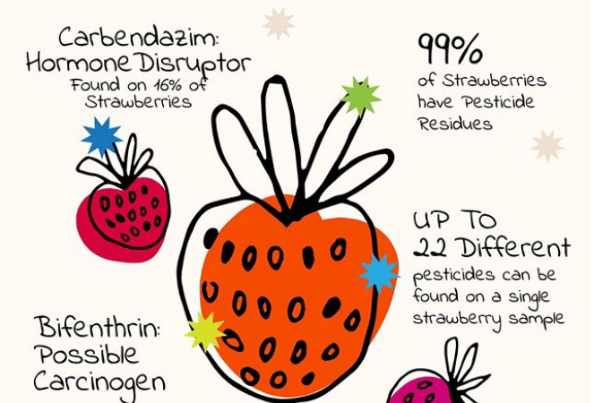 California data from 2015 reveal that nearly 300 pounds of pesticides were applied to each acre of strawberries (compared to about 5 pounds of pesticides per acre of corn, a crop with a notorious reputation for being pesticide laden).
